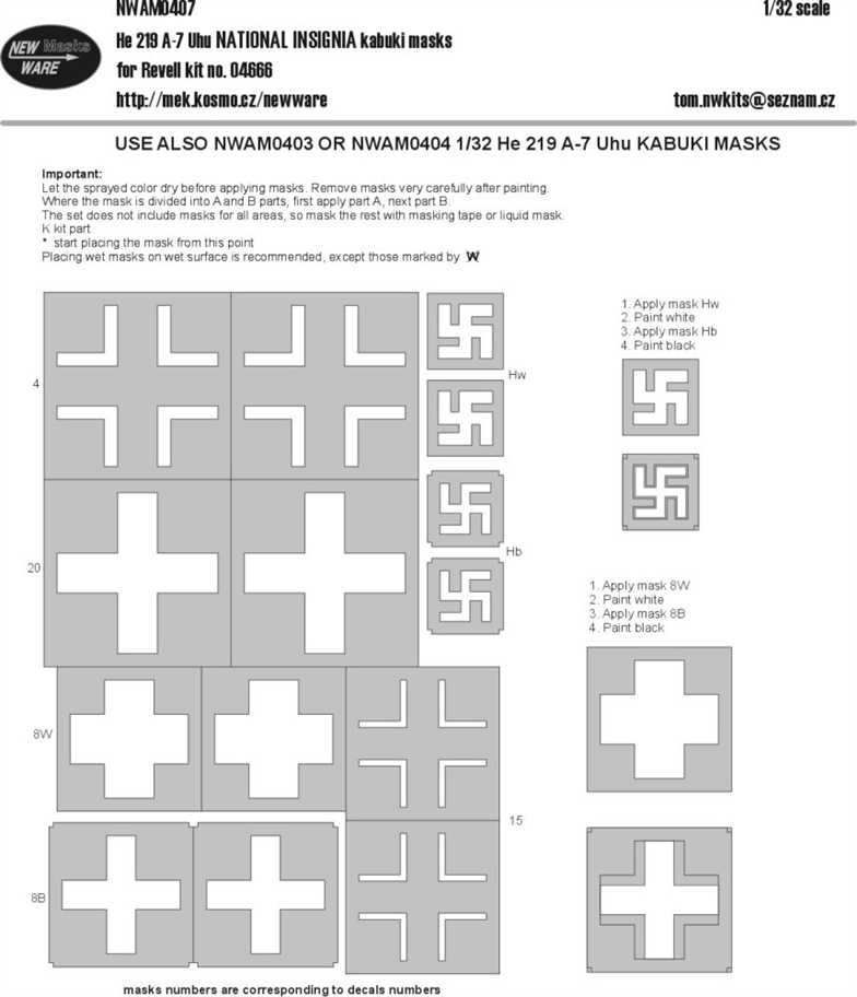 New Ware - 1/32 Heinkel He-219A-7 Uhu NATIONAL INSIGNIA kabuki masks including hakenkreuz. (for Revell kits)