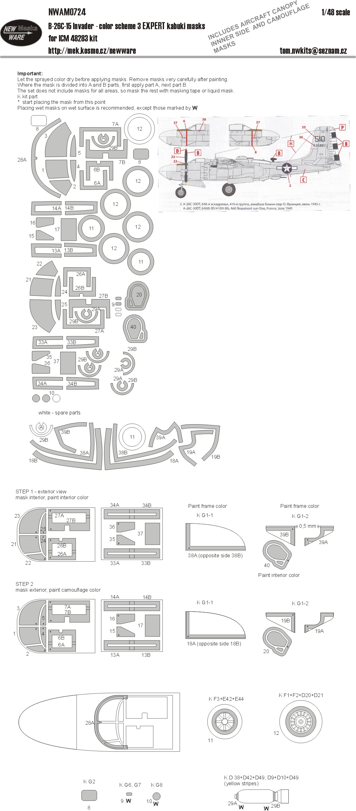 New Ware - 1/48 Douglas B-26C-15 Invader color scheme 3 Expert kabuki masks all windows including inner side masks, wheels, other clear parts, yellow stripes on bombs (for Icm kits)