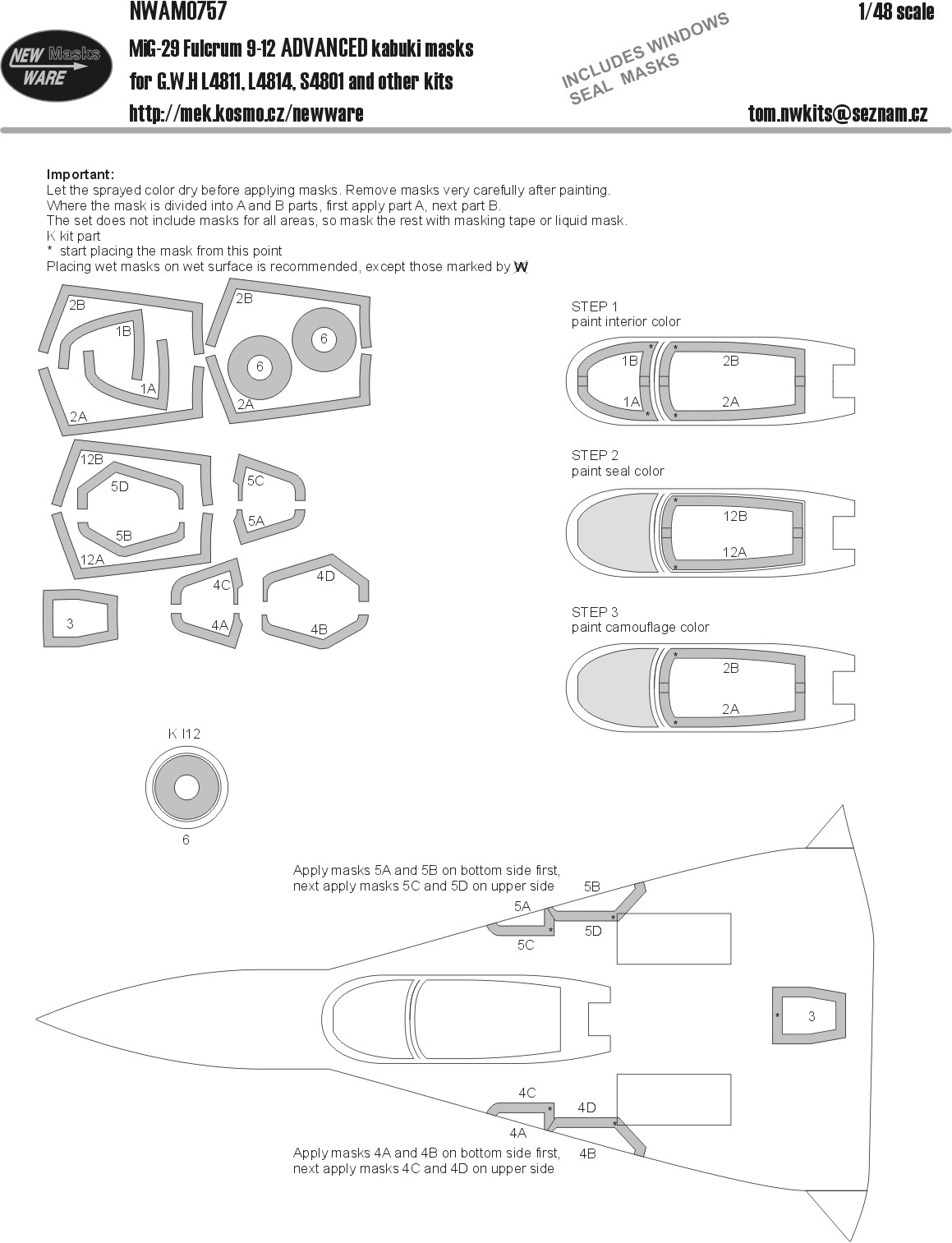 New Ware - 1/48 Mikoyan MiG-29 Fulcrum 9-12 Advanced kabuki masks aircraft canopy including windows seal masks, camouflage details (for Great Wall Hobby kits)