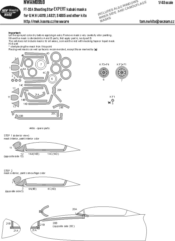 New Ware - 1/48 Lockheed FT-33A Shooting Star Expert kabuki masks aircraft canopy including inner side masks, other clear parts, wheels, camouflage elements (for Great Wall Hobby kits)