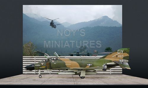 Noy's Miniatures - 1/144 Scale "South East Asia (SEA) Airfield set with Backdrop". Two 1/144 sheets. Approx. dimensions of each sheet: Length: 14.8 cm / 5.8 inch; Width: 10.5 cm / 4.1 inch. A unique and innovative tarmac sheet set representing a US airfield during the Sea conflict. This new state-of-the-art sheet set is aimed at the Sea US aviation enthusiast and includes 2 sheets: The first sheet depicts the concrete surface upon which the aircraft park; the second is a backdrop sheet depicting a typical and accurate revetment wall, a view of the airbase behind it with Vietnamese forest mountains in the background and a US helicopter hovering above. The set will fit many US aircraft types of the period and will therefore appeal to many aircraft models enthusiasts.