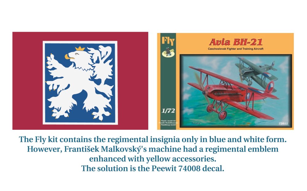 Frantisek Malkovsky was the first 'king of the air' in Czechoslovakia, military pilot and acrobat. He had its red Avia BH.21 which is also in the kit from Fly 72011. In the kit is the regiment badge in the standard form, white lion on the blue base. The aircraft of Malkovsky had yellow crown and claws on the lion in the badge and my decals have it too. There is the question how it can be interesting for those who never heard about Malkovsky...
