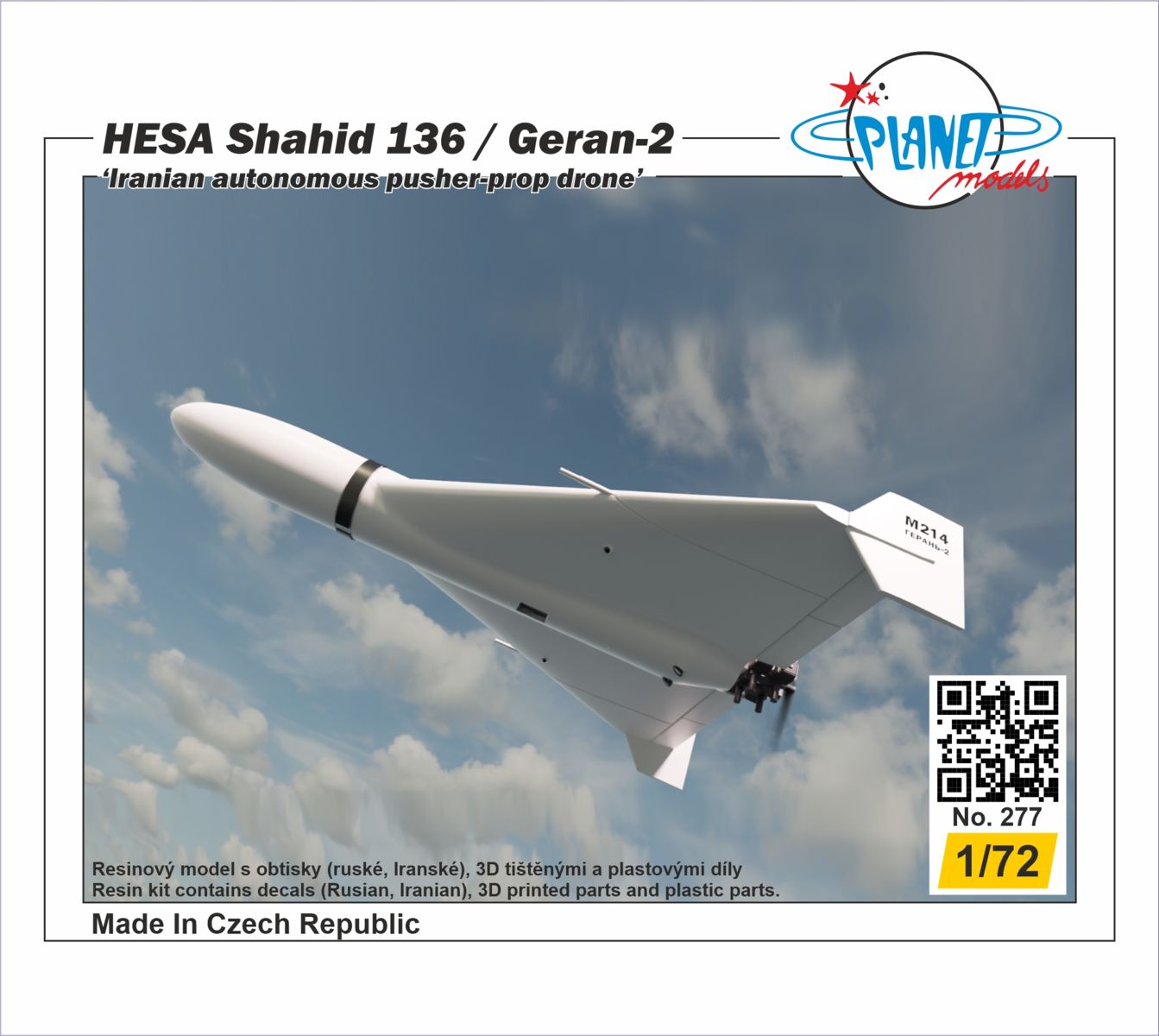 Planet - 1/72 Hesa Shahid 136 / Geran-2 Iranian The Iran-made Hesa Shahid 136 / Geran-2 drone is used by the Russian military to terrorize Ukraine and to attack its civil infrastructure. Our model is resin cast and comes with a few 3D-printed parts and is available in the Planet Model range. It also has a sheet of decals.