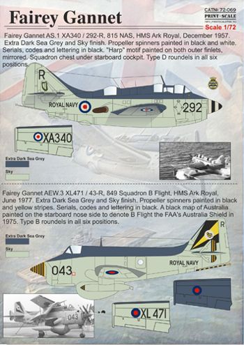 1. Fairey Gannet AS.1 XA340 / 292-R, 815 NAS, Hms Ark Royal, December 1957. Extra Dark Sea Grey and Sky finish. Propeller spinners painted in black and white. Serials, codes and lettering in black. "Harp" motif painted on both outer finlets, mirrored. Squadron chest under starboard cockpit. Type D roundels in all six positions.