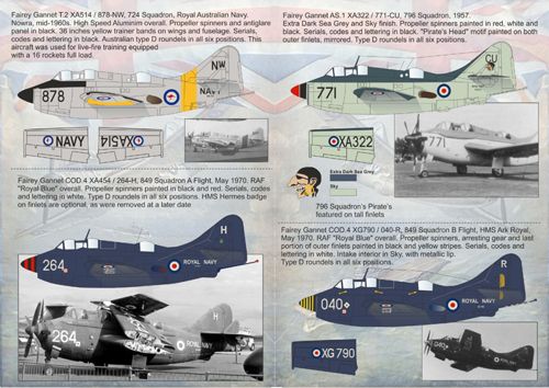 5. Fairey Gannet AS.1 XA322 / 771-CU, 796 Squadron, 1957. Extra Dark Sea Grey and Sky finish. Propeller spinners painted in red, white and black. Serials, codes and lettering in black. "Pirate's Head" motif painted on both outer finlets, mirrored. Type D roundels in all six positions.