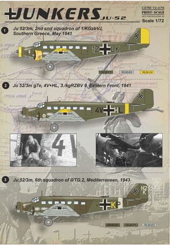 Print Scale - 1/72 Junkers Ju 52/3M 1. Ju 52/3m, 2nd snd squadron of 1/KGzbV.I, Southern Greece, May 1941 2. Ju 52/3m g7e, 4V+HL, 3./kgRZBV 9, Eastern Front, 1941 3. Ju.52/3m, 6th squadron of II/TG.2, Mediterranean, 1943 4. Ju 52/3m g4e, 4U+NH, allocated to 2. (F)/123,Derna, Northern Africa, June 1941 5. Among the Ju 52/3m g7es assigned to the VII. Fliegerkorps (7th Air Corps) was this aircraft (V1+LP). The Corps operated on the Eastern Front during the winter of 1943-44 WARNING: THERE IS AN ERROR ON ONE SWASTIKA ON TAIL, IT IS ON WRONG SIDE. IF YOU PURCHASE IT, THERE WILL BE NO EXCHANGE OR SPARE PART FOR THIS ERROR. YOU CAN USE THE OTHER DECALS WITHOUT ANY PROBLEM