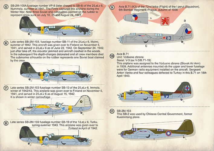 6. Late series SB-2M-103, fuselage number SB-11 of the 2/LeLv 6, Malmi, summer of 1942. This aircraft was given over to Finland on November 5, 1941, and served in 2/LeLv 6 as of June 22, 1942. On September 24, 1942, just after take off, the elevator jammed and aircraft crashed in the woods. In the subsequent fire depth-charges detonated and all crew members died.