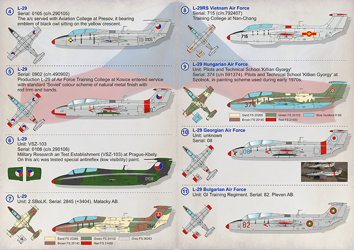 5. L-29. Serial: 0902 (c/n.490902). Production L-29 of Air Force Training College at Kosice entered service with standard 'Soviet' colour scheme of natural metal finish with red trim and bands.