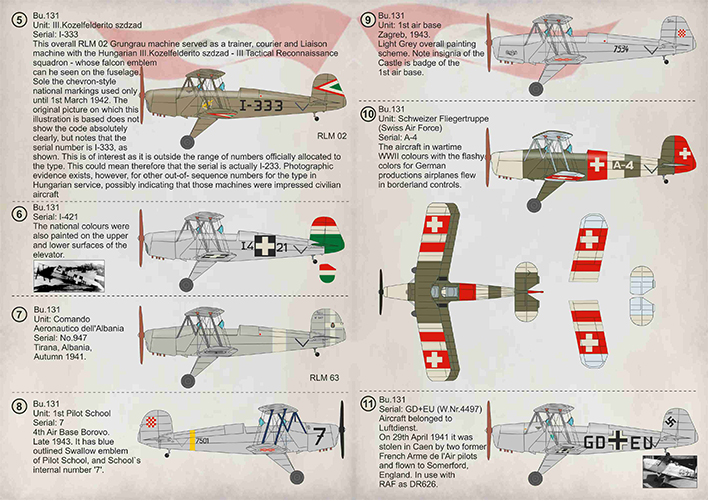 5. Bu.131. Unit: III.Kozelfelderito szdzad. Serial: I-333. This overall RLM 02 Grungrau machine served as a trainer, courier and Liaison machine with the Hungarian III.Kozelfelderito szdzad - III Tactical Reconnaissance squadron - whose falcon emblem can he seen on the fuselage. Sole the chevron-style national markings used only until 1st March 1942. The original picture on which this illustration is based does not show the code absolutely clearly, but notes that the serial number is I-333, as shown. This is of interest as it is outside the range of numbers officially allocated to the type. This could mean therefore that the serial is actually I-233. Photographic evidence exists, however, for other out-of- sequence numbers for the type in Hungarian service, possibly indicating that those machines were impressed civilian aircraft.