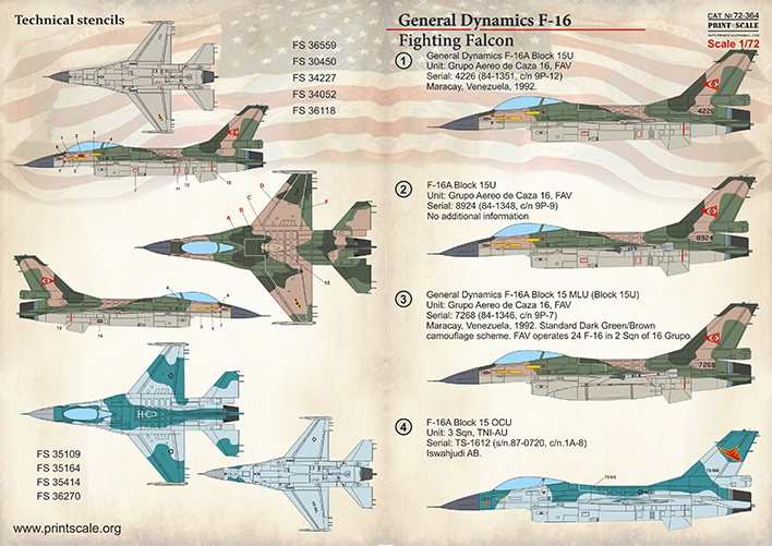 Print Scale - 1/72 Genera-Dynamics F-16A Fighting Falcon. Venezuela, Indonesia, Romania