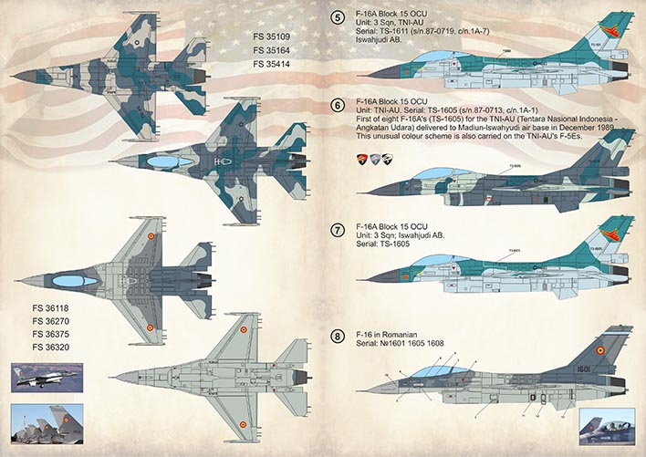 6. F-16A Block 15 OCU. Unit: TNI-AU. Serial: TS-1605 (s/n.87-0713, c/n.1A-1). First of eight F-16A's (TS-1605) for the TNI-AU (Tentara Nasional Indonesia Angkatan Udara) delivered to Madiun-lswahyudi air base in December 1989. This unusual colour scheme is also carried on the TNI-AU's F-5Es.