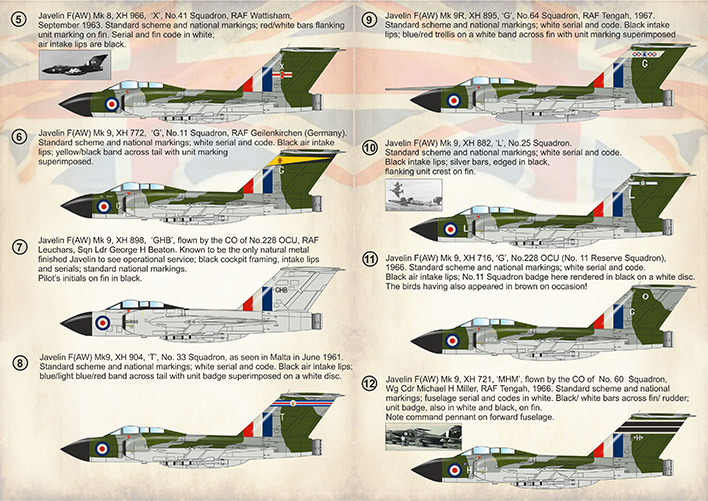 Javelin F(AW) Mk 9, Xh 716, G , No.228 Ocu (No. 11 Reserve Squadron), 1966. Standard scheme and national markings, white serial and code. Black air intake lips, No.11 Squadron badge here rendered in black on a white disc. The birds having also appeared in brown on occasion!