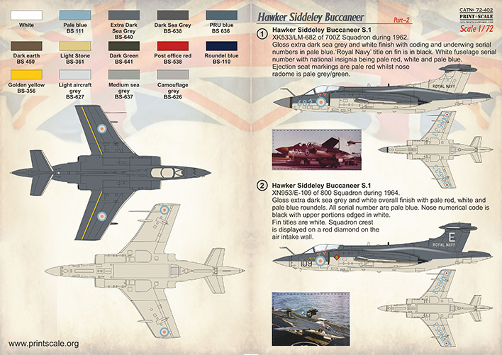 2.Blackburn Buccaneer S.1. XN953/E-109 of 800 Squadron during 1964.Gloss extra dark sea grey and white overall finish with pale red, white and pale blue roundels. All serial number are pale blue. Nose numerical code is black with upper portions edged in white. Fin titles are white. Squadron crest is displayed on a red diamond on the air intake wall.