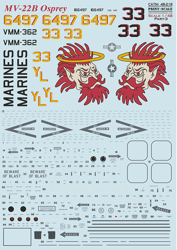 Print Scale - 1/48 Bell/BoeingMV-22B Osprey. Registration: 166497 / YL-33. Airline: United States US Marine Corps (USMC). Special Tail for VMM-362 the 'Ugly Angels' at Mcas Miramar.