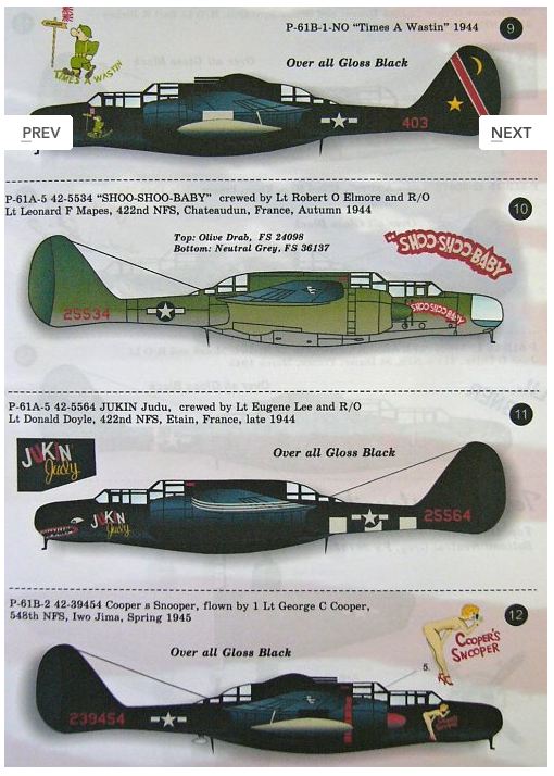 Print Scale - 1/72 Northrop P-61A-1/ P-51A-7/P-51B-2 Black Widow. 1. P-61A-1 42-5524 'Midnight Mickey',crewed by 2Lt Mc Cumber, R/O Flt Off Daniel Hinz and Gunner Pvt Peter Dutkanicz, 6th NFS, Saipan, mid-1944