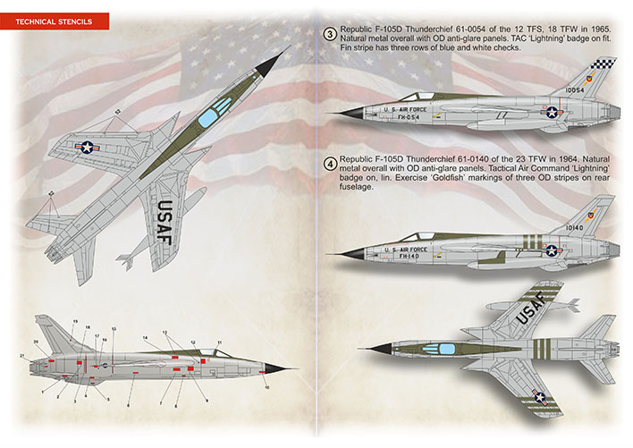 4. Republic F-105D Thunderchief 61-0140 of the 23 Tfw in 1964. Natural metal overall with Od anti-glare panels. Tactical Air Command 'Lightning' badge on, lin. Exercise 'Goldfish' markings of three Od stripes on rear fuselage.