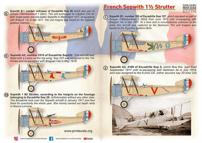 1. Sopwith B1, number 185 of Escadrille Sop 107, which operated as part of Groupe d'Bombardmet 3 Gb3 from June 1917 until re-equipping with Breguet 14s in late 1917. At a time and in circumstances unknown to the artist, this aircraft was captured dy the Germans. The unit lnsignia was based on the Egyptian goddess Buto.