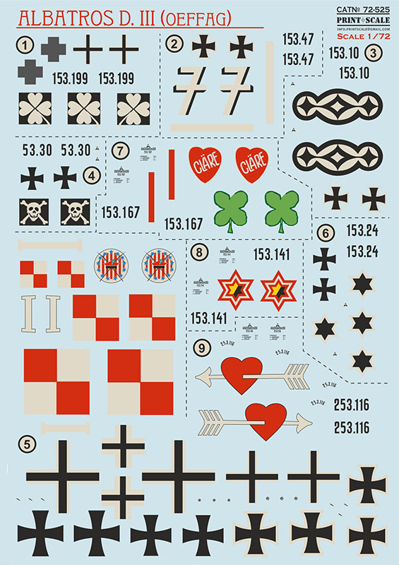 Print Scale - Albatros D.III OEFAG A 1/72 scale decal for building a model of the light-duty version of the Great War Albatros III aircraft produced by the Austrian factory Oesterreichische Flugzeugfabrik Ag Oeffag. Includes 9 variants plus specialized camouflage.