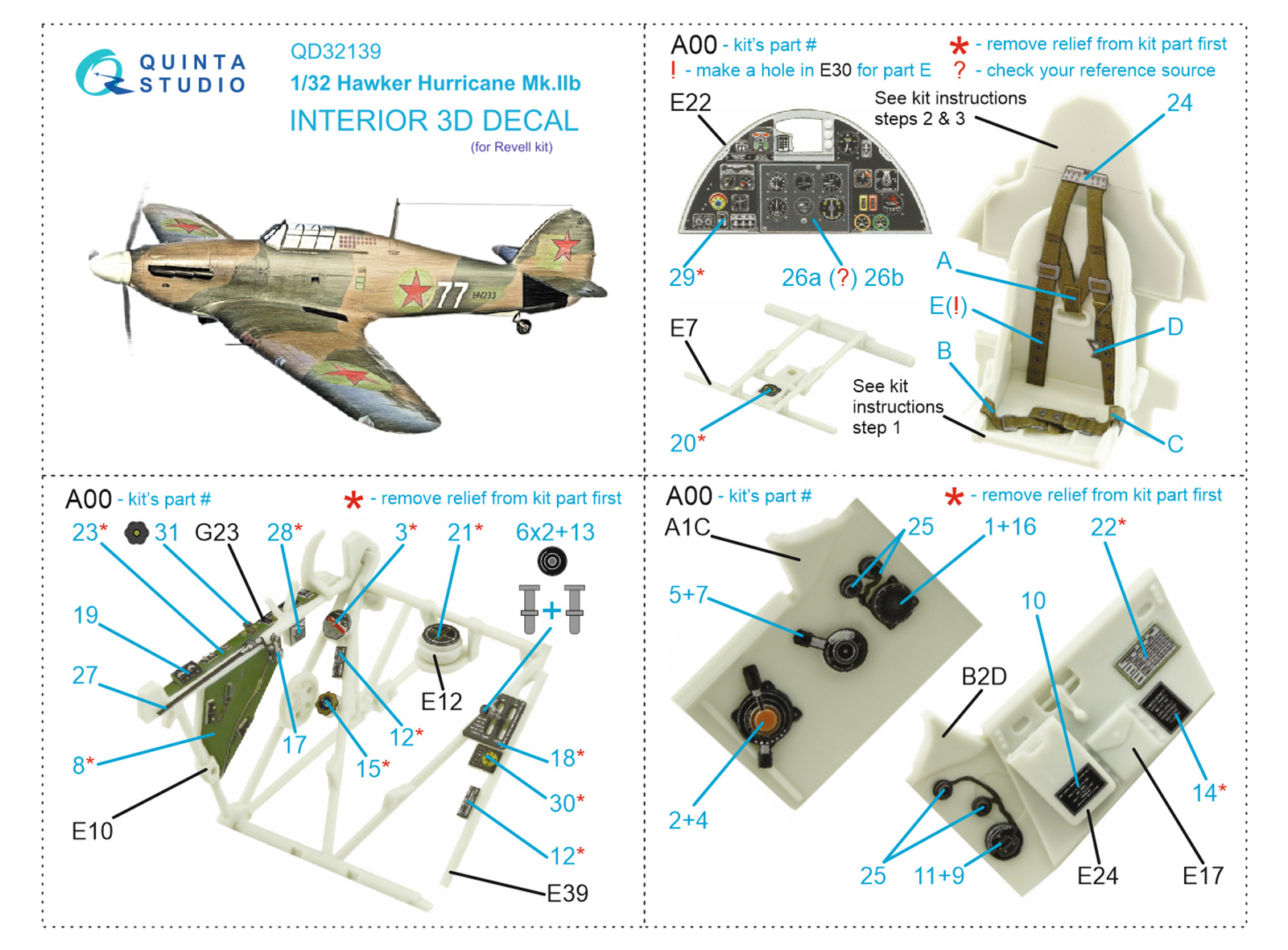 Quinta Studio - 1/32 Hawker Hurricane Mk.IIb 3D-Printed & coloured Interior on decal paper (for Revell kits)