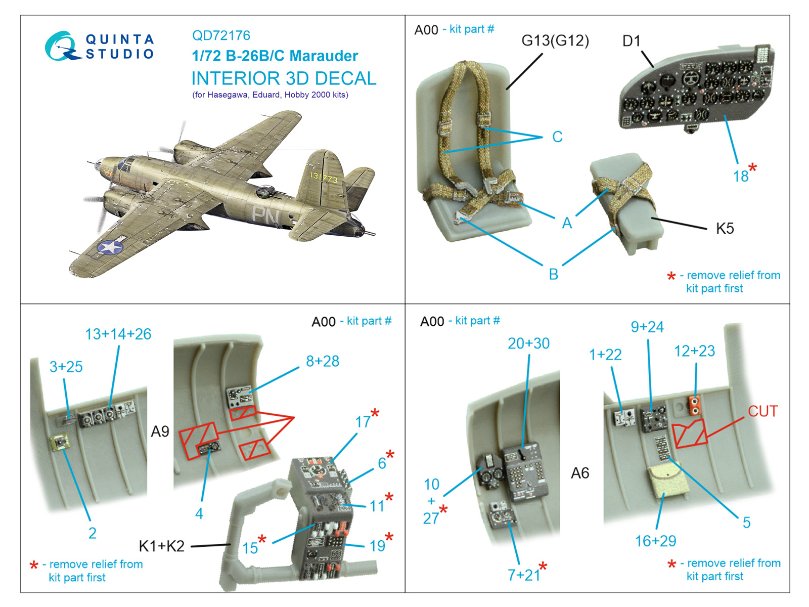 Quinta Studio - 1/72 Martin B-26B Marauder 3D-Printed coloured Interior for Eduard, Hasegawa and Hobby 2000