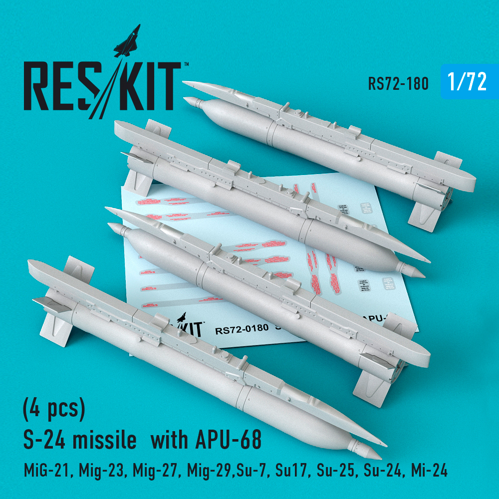 ResKit - 1/72 S-24 missiles with APU-68 (4 pcs) Mikoyan (MiG-21, MiG-23, MiG-27, MiG-29, Sukhoi Su-7, Su-17, Su-25, Su-24, Mil Mi-24)
