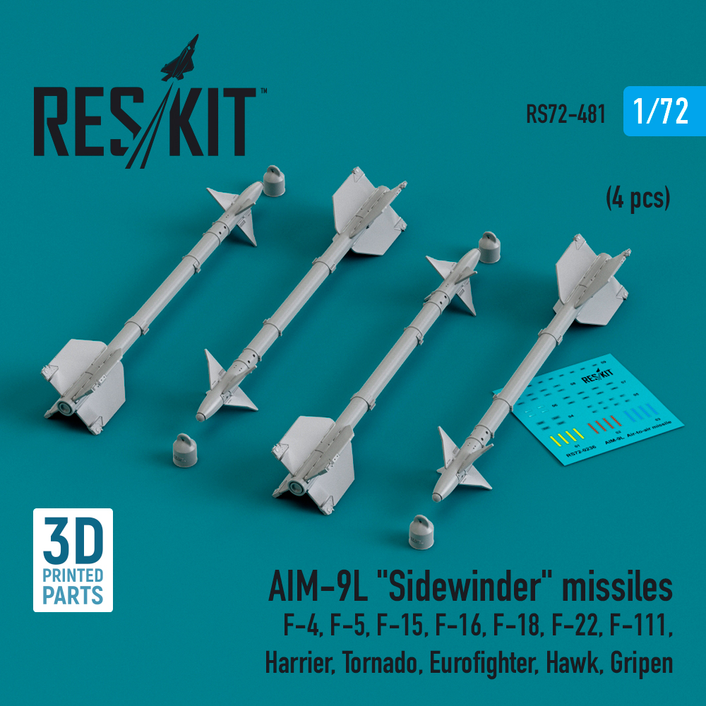 ResKit - 1/72 AIM-9L Sidewinder missiles (4 pcs) (McDonnell F-4, Northrop F-5, McDonnell F-15, F-16, F-18, Lockheed-Martin F-22, General-Dynamics F-111, BAe Harrier, Panavia Tornado, Eurofighter, Hawk, Gripen) (3D-Printed)
