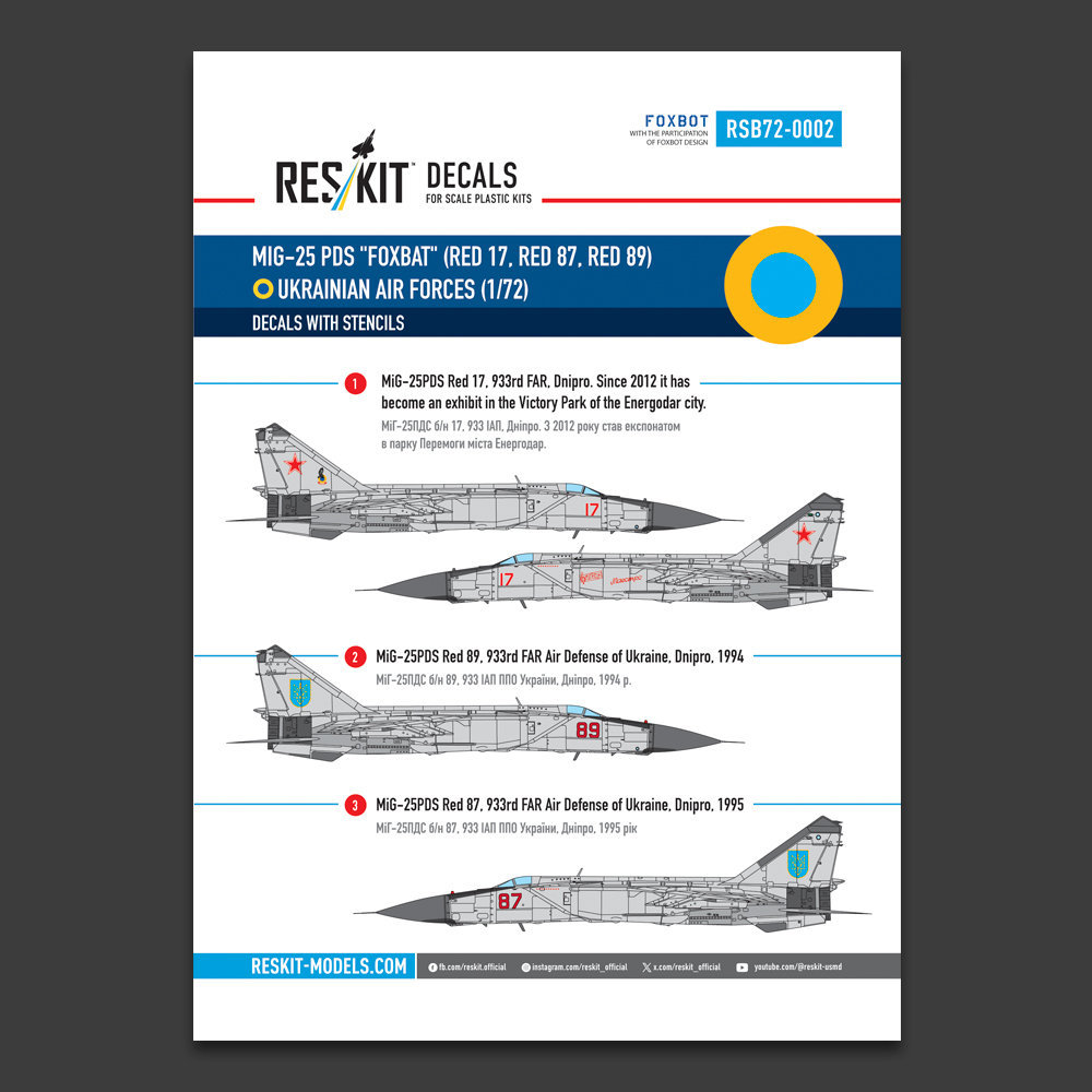 Foglio decalcomanie RESKIT in scala 1/72 con marcature dell'Aeronautica Militare Ucraina per il MiG-25PDS Foxbat.
