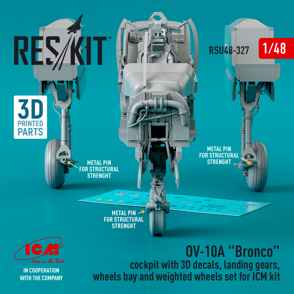 ResKit - 1/48 North-American/Rockwell OV-10A 'Bronco' cocKPit with 3D decals, landing gears, wheels bay and weighted wheels set for ICM 3D-Printed