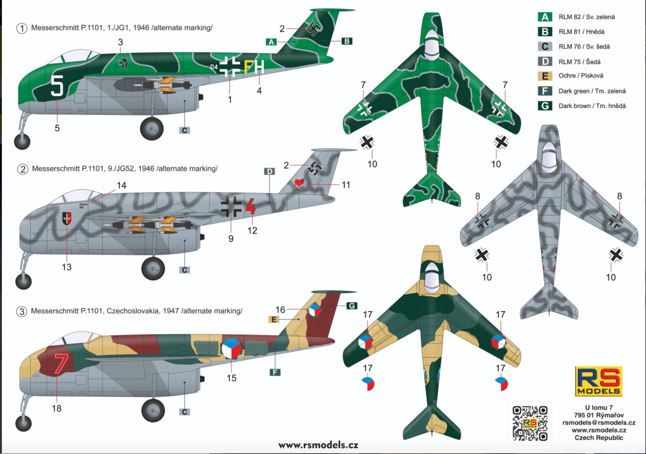 The Messerschmitt P.1101 was commissioned by Okl in the summer of 1944 and was the first aircraft in the world to have variable wing geometry. It could only be built on the ground at a yaw angle of 35° to 45°. 3 decal variants: