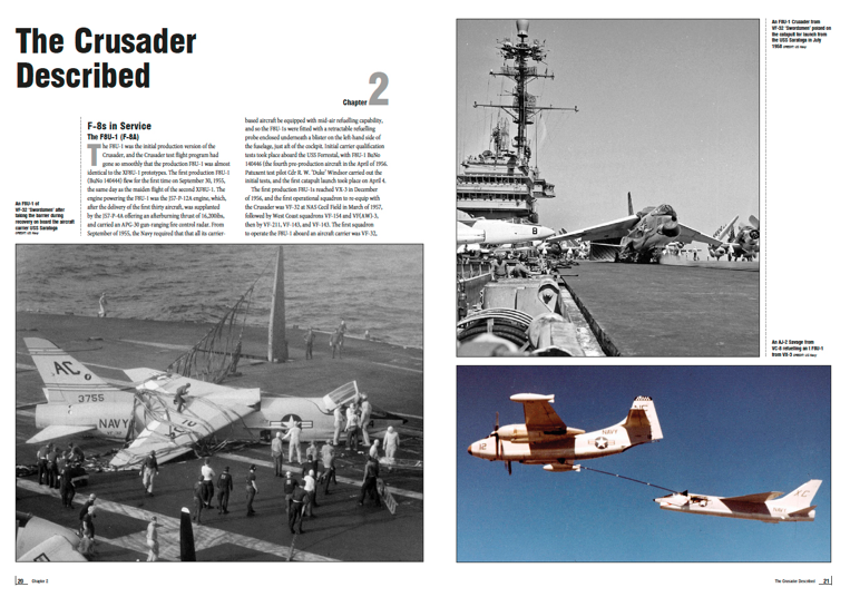 SAM Publications - MDF32 The Vought F-8 Crusader was a direct response to a United States Navy requirement for a modern supersonic, carrier-based fighter. Utilising nearly the identical powerplant of the North American F-100 Super Sabre and looking like the big brother of the A-7 Corsair, the F-8 Crusader became the world's first carrier-based aircraft to break the speed of sound. [F-8E F-8J]