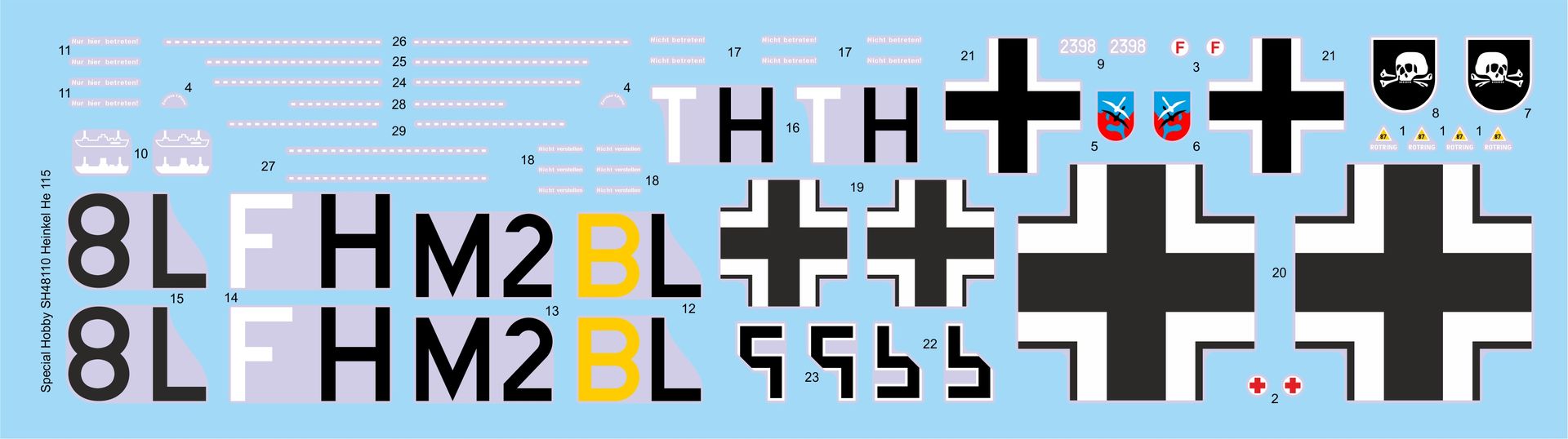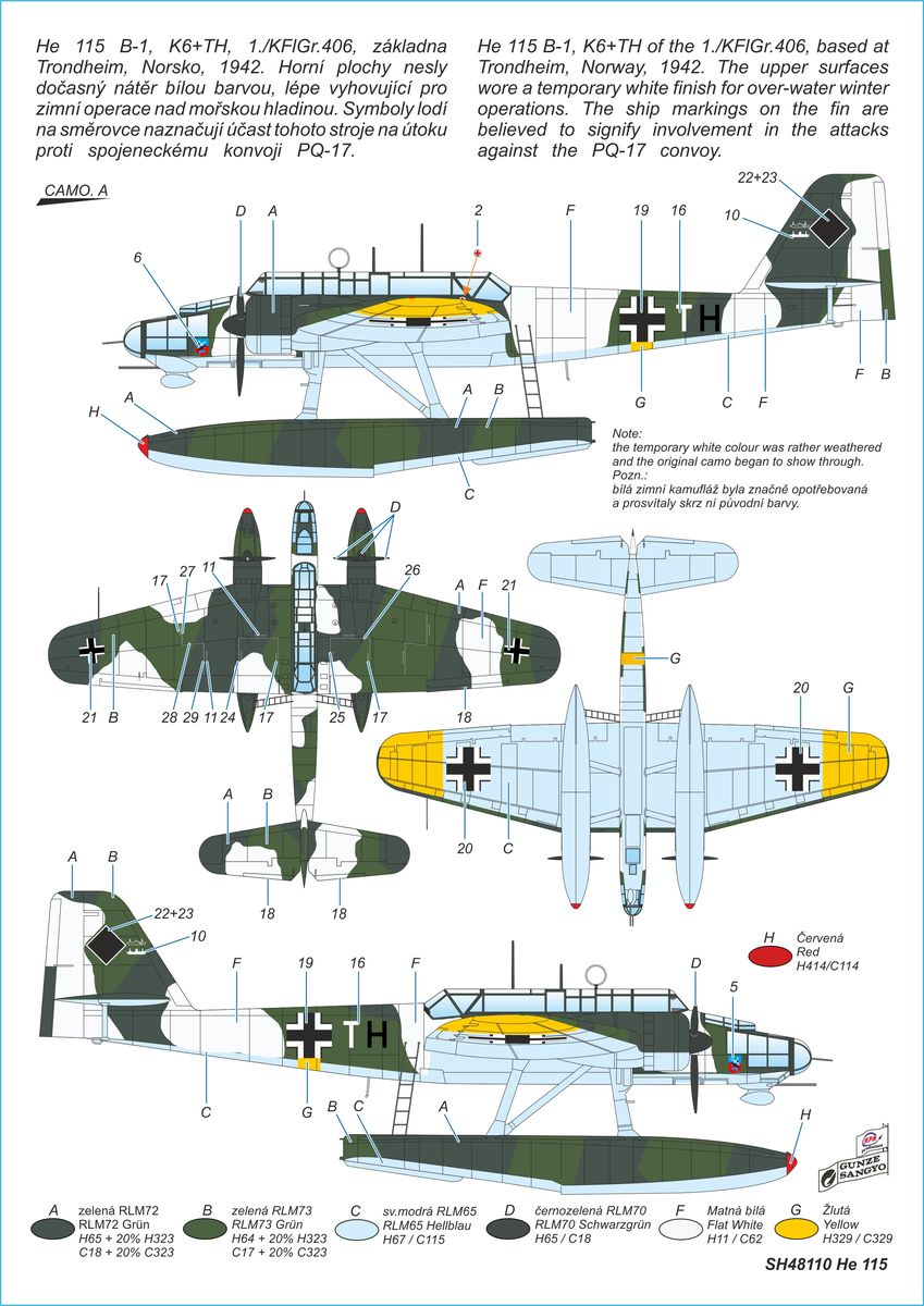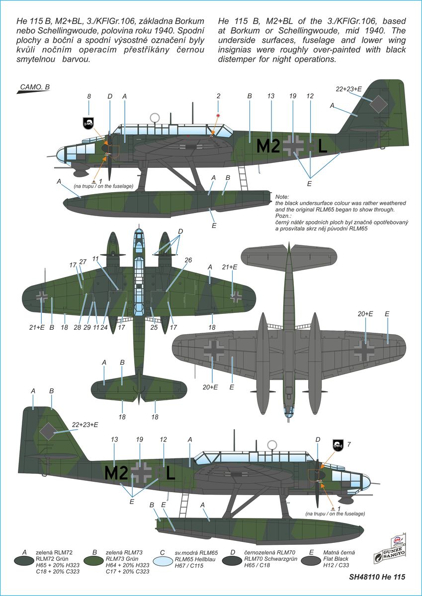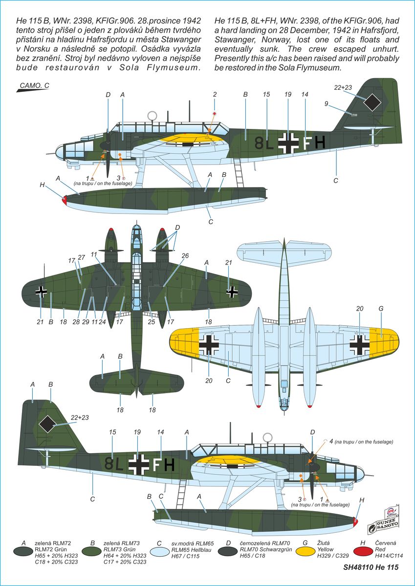 Special Hobby - 1/48 Heinkel He 115 floatplane. Huge Heinkel He-115 floatplanes reigned the sea between the Uk and Soviet Murmansk in the first phases of the Second World War. German Luftwaffe deployed them during the attack on Norway as well as against the convoys routes. Yet before the war, the He-115 floatplanes were successfully tested in Spain and were exported, by coincidence also to Norway. Norwegian planes were involved in fighting against the Germans and one of them managed to escape and flew to Britain. The He-115C version in the Luftwaffe colours contains decals for three machines, including 8L+FH that has been recently raised from its sea bed. The model contains seven parts, injected clear canopy parts and resin parts.