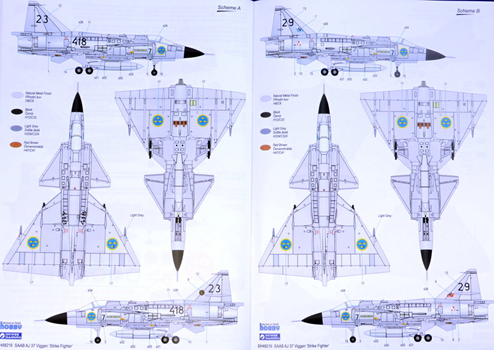 Special Hobby - 1/48 Saab AJ-37 Viggen The Saab 37 Viggen was an aircraft well ahead of its time. Unorthodox solutions chosen by its designers not only enabled the type to meet all the requirements, but to even surpass them in a couple of respects. The Swedish military ordered the jet in several various versions which all would share a common platform, which joined only by some special equipment would permit the operation in several various roles. The power plant used in the airframe was the Volvo RM8, which in fact was a licence-built Pratt & Whitney JT8D airliner turbofan fitted with the afterburner and thrust reverser. This chosen engine, alongside with the unique concept of delta wing and delta-shaped foreplanes gave the airframe unique capabilities mainly during the take off and langing on short runways. For better handling in restricted spaces of auxiliary air bases, for easier storage in concrete hardened hangars and to allow better concealment of the aircraft in outside pens, the tail fin was designed as folding. The avionics of the type was the state of the art at that time, the Viggen was the very first fighter jet to be equipped with an integrated circuits computer. The first of the Viggens to be introduced to service with the Swedish air force was the Aj 37 Vigger, shortly followed by the Sk 37 dual control fighter trainer, the Sf 37 reconnaissance type with camera carried in the improved nose section and the SH-37 antishipping version with different avionics and specialised air-to-sea armament. In about ten years time after the first Viggen had entered the service, the second generation of the type came about, the pure fighter Ja 37s.