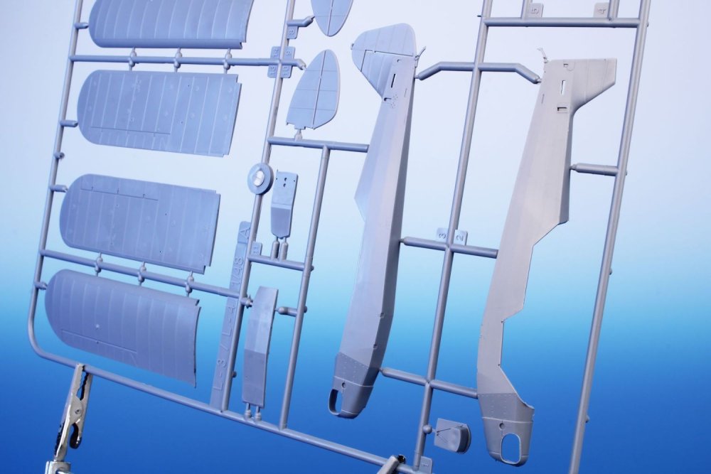 The kit comes on two grey styrene sprues, one with clear parts, a photo etched fret and a sheet of decals with markings for the four schemes.