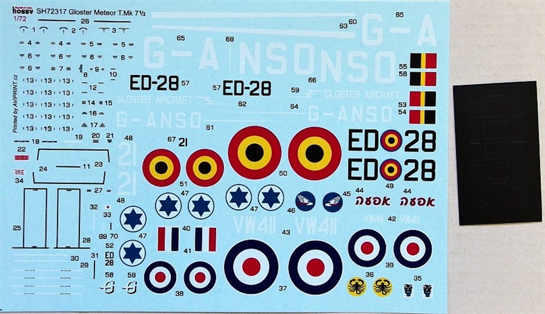 Special Hobby - 1/72 Gloster Meteor T Mk 7.5 1/72Gloster T Mk.7 trainer aircraft (available under no.72548) was one of the most widespread variants of the Meteor jet fighter aircraft. Only a handful of the Meteor T Mk.7 was equipped with a larger and squared off tail taken from the more modern Mk 8 fighter version. This new trainer variant got some what peculiar designation Meteor T Mk 7.5 (T Mk 7 ? was also used). While these planes were used in Great Britain mainly for various test flights and public shows, in the Belgian and Israeli air forces they served as standard training machines.The kit contains five frames of plastic parts, three of them in standard greyish styrene, the other two which contain the canopy and recce nose parts are made of clear plastic. The decal sheet offers markings for the Gloster company demonstration aircraft which was blue overall with white coloured stripes and civil registration codes. It was also equipped with non-standard wing-tip fuel tanks. The other British aircraft in this kit is the RAE test machine in dark blue overall and with a non-standard reconnaissance nose. This pair is accompanied by a silver Belgian machine with yellow trimmings and a camouflaged Israeli plane wearing a name on its nose (Ef´eh, ie Viper).[ ] More...