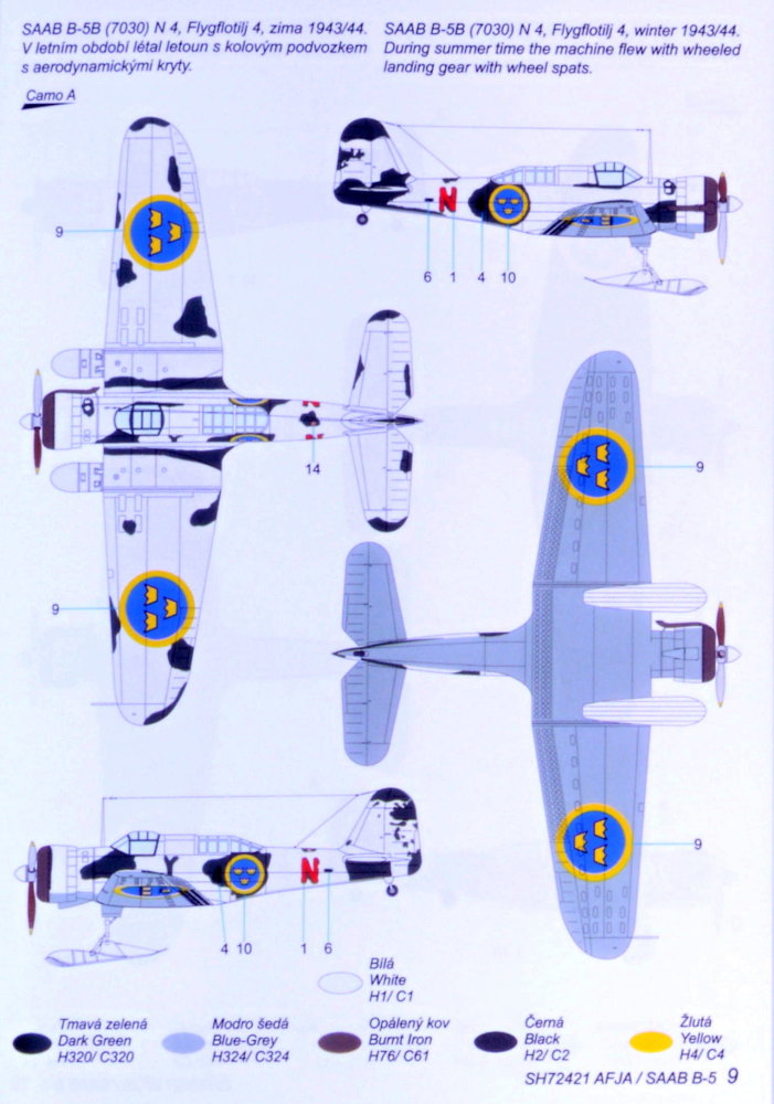 This kit has been created the same way as the original was, ie.by adapting the A-17 type. So, it contains resin parts, vacuum-formed canopy and two frets of etches (pre-coloured and a plain one) The decal sheets brings markings for three Swedish machines in various styles of camouflage patterns.
