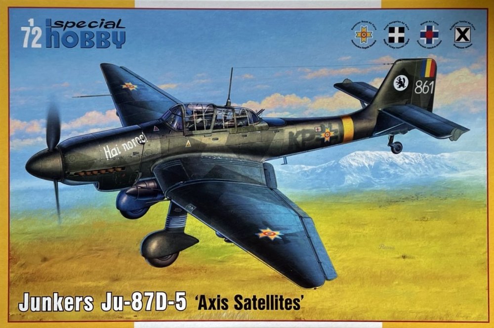 Special Hobby - 1/72 Junkers Ju-87D-5 'Axis Satellites' Hungary, Rumania, Bulgaria, Slovak state Academy's top quality styrene injected parts of their Junkers Ju 87G-2 kit has been joined now by Special Hobby's own new conversion parts enabling the modeller to build the original kit in the D-5 variety. On top of that, we have to say that our parts also tackle a few of the trouble spots the Academy kit unfortunately possesses. This version actualy was the final one of all Stuka bomber versions and was operated not just by the Luftwaffe but by other German allies too. So, the decal sheet and colour schemes included in the kit portray machines flown in Rumania, Hungary, Slovakia and Bulgaria.The Rumanian machine was adorned with lettering on either side of the fuselage while the Hungarian one carries a name.