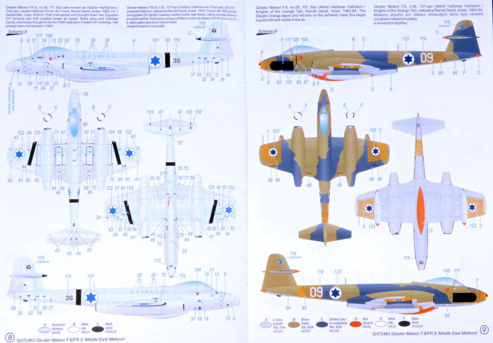Special Hobby - 1/72 Gloster Meteor Mk.8/Mk.9 Iaf The Gloster Meteor was one of the world's very first jet fighters. The first two versions of the Meteor were introduced into service with the Raf in time to see the deployment int he final stages of the war. The development of the type went on after the war, with the first post war version being the Mk.4. Next, more advanced F.8 fighter and FR.9 fighter-reconnaissance types were both operated by the Raf and exported to overseas forces. Besides several European air forces, these types also flew in Australia as well as with a couple of Middle Eastern countries, which as it happened were actually in war with each other. The Meteors became the first jets of the Israeli air force, but they were also pressed into service alongside Vampire jets in Egypt and Syria.