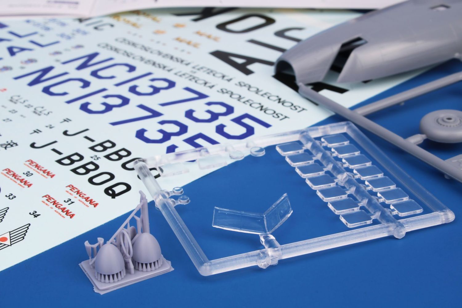 Special Hobby - 1/72 Douglas DC-2 'Transport Revolution' In August 1932, the Trans World Airlines called on five aircraft manufacturers to submit proposals for a new transport aeroplane based on TWA's specifications. Douglas company accepted that challenge and decided to design a highly advanced twin engine aircraft. The first prototype known as the DC-1 (Douglas Commercial No.1) took to the air for the first time on 1 July 1933. Twa placed an order for 20 production aircraft which were redesignated the DC-2 and had Wright Cyclone SGR-1820-F3 power plants, their fuselage was a bit longer and accomodated 14 passenger seats. The first of the DC-2s took off on 11 May 1934 and its flying career with the Twa commenced on 18 May. Regular flight operations of DC-2 began in July. The Douglas factory manufactured about 200 DC-2s which went to serve both with civilian operators and the military. A licence was also bought by Japanese Nakajima that produced six aircraft for domestic Dai Nippon Koku Kobushiki Kaisha. DC-2s quickly spread not only among airliners operating in the US, the succesfull type also flew with a wide range of Europe-based airliner companies, among which were the Swissair, Klm and also the eskoclovenska Letecka Spolenost / Czechoslovak Air Company. The introduction of the DC-2 brought a revolution in the air transport, both in its safety and the economy of operation. The DC-2 was followed by even more famous DC-3 / C-47 Dakota type. The plastic model kit comes on three styrene sprues, one with clear parts and also offers a set of nicely detailed 3D-printed parts. The decal sheet brings markings for four DC-2 as flown over four continents. Over America it was the machine of EAL, Asia is represented by the machine named Tsukuba of the Japanese Dai Nipon Koku Kobushiki Kaisha, over Australia flew the Pengana which is portrayed both in the Ana and Aoa livery. And Europa is represented by Czechoslovak OK-AIC. a real beauty among airliners- machines with interesting history- large decal sheet- detail 3D-printed parts