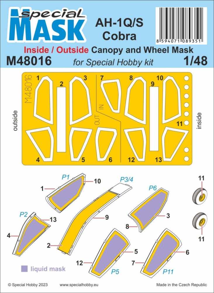 Special Hobby - 1/48 Bell AH-1Q/S Cobra Mask Pre-cut masks to help you with spray-painting both the outside and inside of the extensive canopy glazing of Special Hobby's 1/48 scale AH-1Q/S Cobra models.