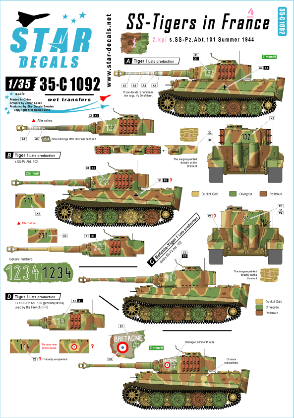Star Decals - 1/35 SS-Pz.Kpfw.VI Tigers in France # 4. s.SS.Pz-Abt 102, Normandie Summer 1944, plus French Pz.Kpfw.VI Tiger.