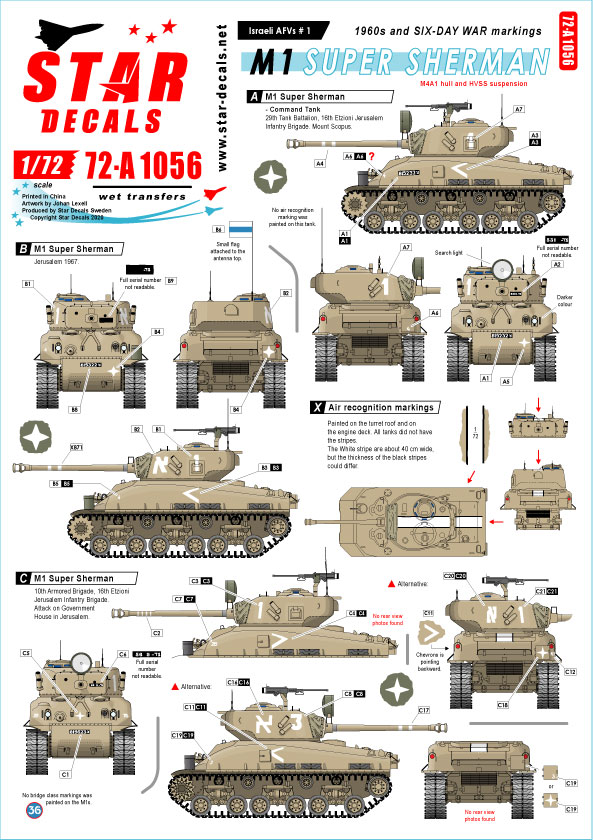 Star Decals - 1/72 Israeli AFVs Part 1. M1 Super Sherman and M1 Super Sherman command tank. 1960s and Six-Day War markings.