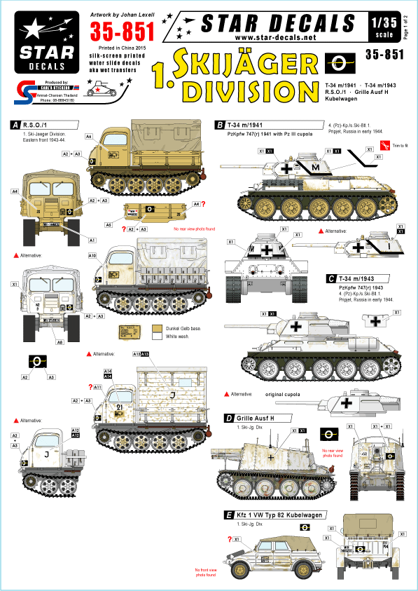 Star Decals - 1/35 Skijager Division Eastern front. Russian T-34 m/41, T-34 m/1943, R.S.O.1 Grille Ausf.H, Kfz 1 Kugelwagen Typ 82