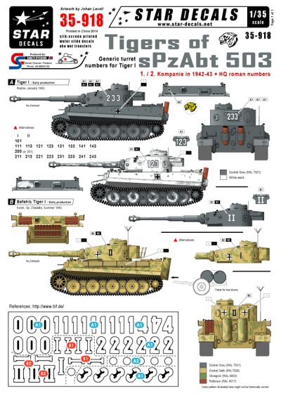 Star Decals - 1/35 Tigers of sPzAbt 503 #1. Generic turret numbers for Early Tiger I. 1. and 2. Kompanie winter 1942-43. Plus roman numbers for Staff tanks 1942-43.