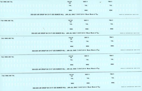 Starfighter Decals - 1/350 Air Group 84 Early 1945. ONLY DECALS. Decal set contain markings for around 90 aircraft including the G markings, numbers, and National Insignia for:VF-84 flying Vought F4U-1D, F6F-5N Corsair, and Grumman F6F-5P VMF-221 flying F4U-1D VFM-451 flying F4U-1D VB-84 flying SB2C-4E VT-84 flying TBM-3. Can be used with any of the 1/350 aircraft from Trumpeter, Hasegawa, Cyber Hobby, and various resin aircraft.
