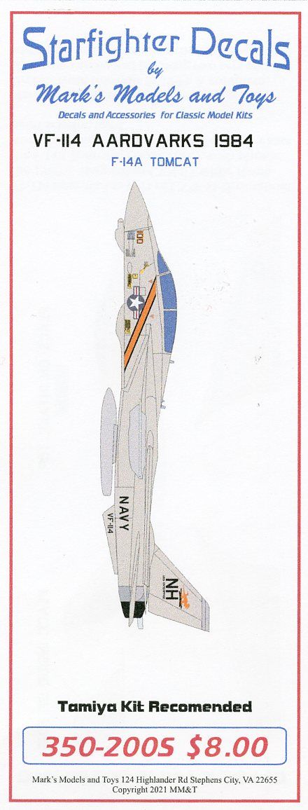 Starfighter Decals - 1/350 VF-114 Aardvarks CVW-11 1980's High Viz Set of 6 markings for VF-114 Aardvarks assigned to CVW-11 Uss Enterprise after the refit. Markings for all of the aircraft included, but two sets of decals are needed for a full squadron markings.