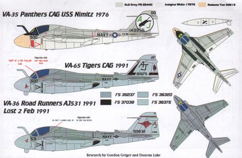Starfighter Decals - 1/144 Colorful Grumman A-6E Intruders (3) 149956 AJ/500 VA-35 Panthers Cag Uss Nimitz 1976 Lt Gull Grey/White, 161675 AJ/500 VA-65 Tigers CAG, 155632 AJ/531 VA-36 Road Runners both Uss Theodore Roosevelt 1991 Lo Viz.