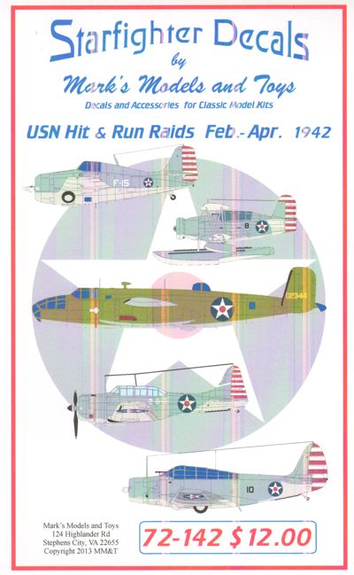 Starfighter Decals - 1/72 USN Hit and Run Raids Spring 1942. Continuing with the USN Themed decal sheets, this set covers the aircraft participating in the US Navy's Hit and Run raids between the Pearl Harbor attack and the Battle of Coral Sea. Sheet covers F4F-3 Wildcats, SBD-3 Dauntless, TBD-1 Devastators, SOC-1 Sea Gulls, and Jimmy Doolittle's B-25B.