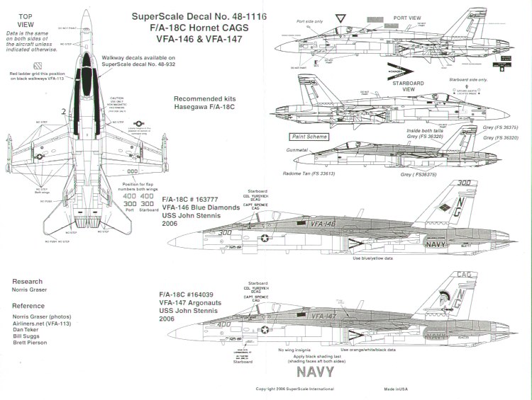 Microscale - 1/48 McDonnell-Douglas F/A-18C Hornets Uss John C. Stennis 2006 (2) 163777 NG/300 VFA-146 Blue Diamonds, 164039 NG/400 VFA-147 Argonauts. Coloured markings