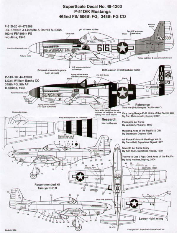 Microscale - 1/48 North-American P-51D/P-51K Mustangs (2) 44-472588/616 462ndFS/506thFG Lt D.S.Bash yellow rear fuselage and fin, 44-12072/100 348thFG/5thAF Lt Col W.Banks Co `Sunshine' black fuselage bands. Both Iwo Jima 1945