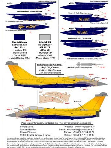 Syhart - 1/144 Scale Dassault Rafale C 113-HJ "Tigermeet 2013" EC1/7 "Provence" To save the "Tiger" traditions of the Ec 1/12 "Cambresis" after its retirement and the closure of Cambrai Ab on march 2012 (Syhart 072 & 073). The tiger badge from Cambresis squadron (SPA162) was reassigned to the